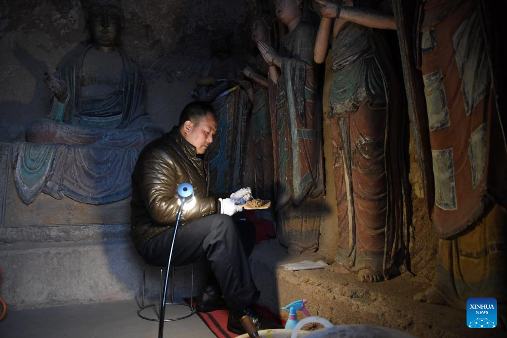 Mu Changyou, a cultural relics restorer of Maiji Mountain Grottoes art institute, performs restoration work of a statue at a cave of the Grottoes in Tianshui City, northwest China's Gansu Province on Dec. 25, 2019. Mu Changyou, 59, has worked on relics restoration for four decades at Maiji Mountain Grottoes, one of the four most famous grottoes in China. Starting as an apprentice, Mu had spent more than 10 years doing chores like cleaning caves, arranging tools, mixing mud and twisting hemp ropes etc. Thanks to constant interactions with and guidance by weathered masters in this walk of life, along with diligence in reading of professional books and hands-on practice, Mu eventually turned himself from a farmer to a senior cultural relics restorer.