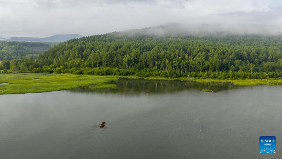 Shrouded in mist, the Wusulangzi Lake presented a charming ecological picture in the midsummer morning. (Xinhua/Ma Jinrui)