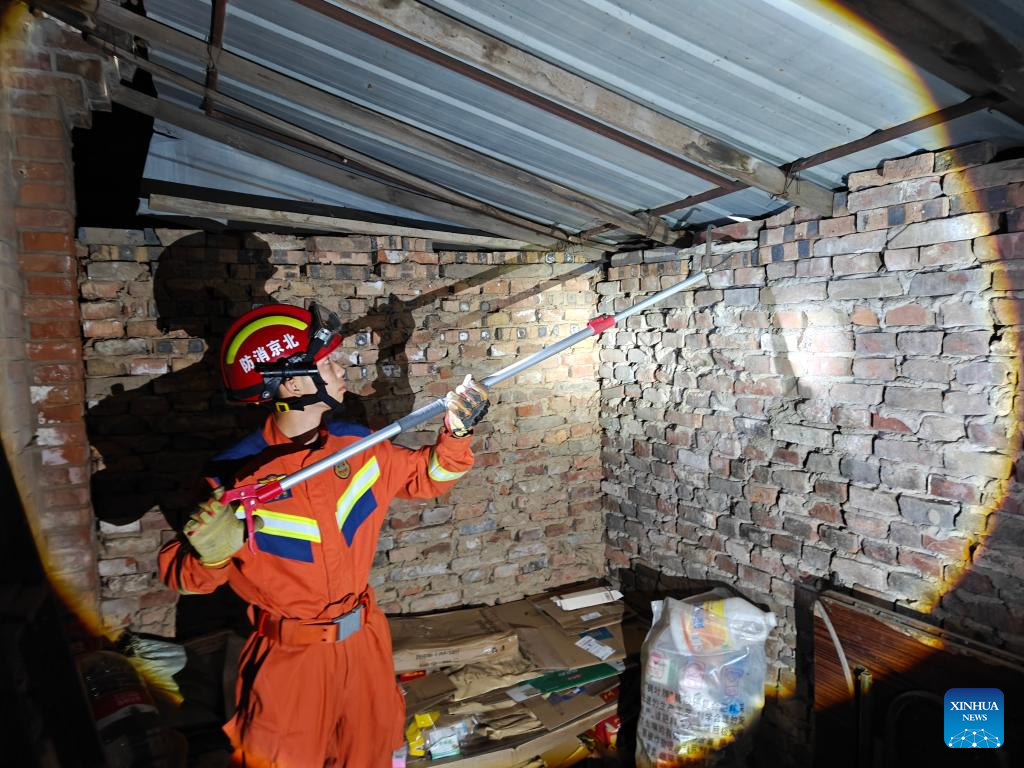 This photo provided by the local fire authorities shows firefighters capturing a snake at a residential home in Huairou District, Beijing, capital of China, June 15, 2025. (Xinhua)