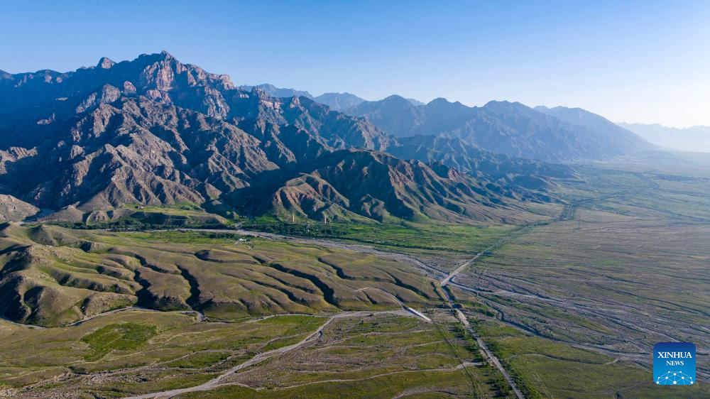 An aerial drone photo taken on July 29, 2025 shows lush grass and trees at the foot of the Helan Mountain in northwest China's Ningxia Hui Autonomous Region. (Xinhua/Wang Peng)