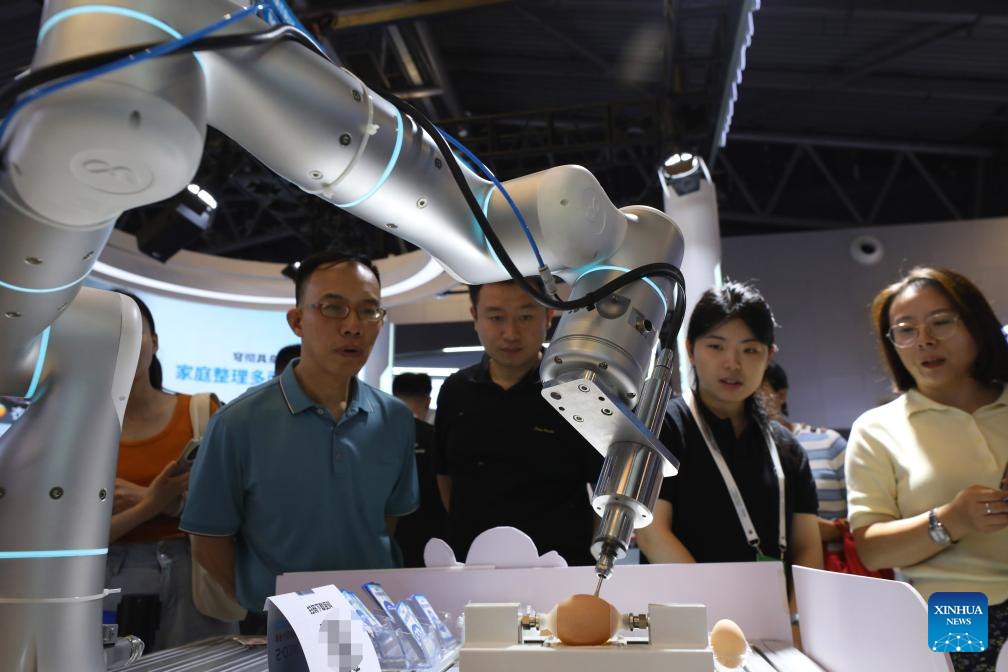 Visitors watch a robot carving on an eggshell at the 2025 World AI Conference (WAIC) in east China's Shanghai, July 29, 2025. The multitude of intelligent robots on display have attracted lots of attention at the 2025 WAIC in Shanghai. Besides the ones that are versed in calligraphy and martial combat, there are also a range of robots adept at performing practical tasks in diverse work and life scenarios. (Xinhua/Fang Zhe)