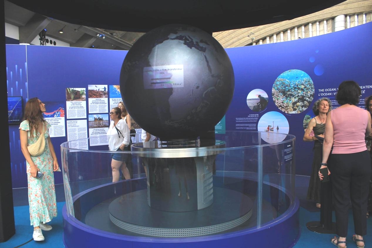 A model showcasing the dynamics of global currents is exhibited at the venue of the third United Nations Ocean Conference in Nice, France. (People's Daily/Shang Kaiyuan)