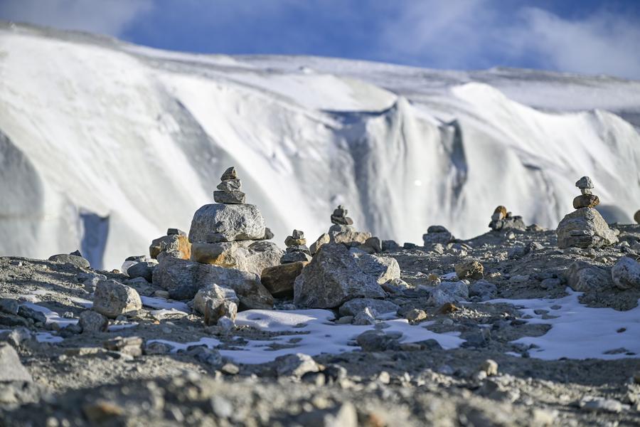 Stacks of stones in a bid for blessings are pictured in the Muztagata glacier park, Taxkorgan Tajik Autonomous County, northwest China's Xinjiang Uygur Autonomous Region, Jan. 12, 2025. (Xinhua/Chen Shuo)