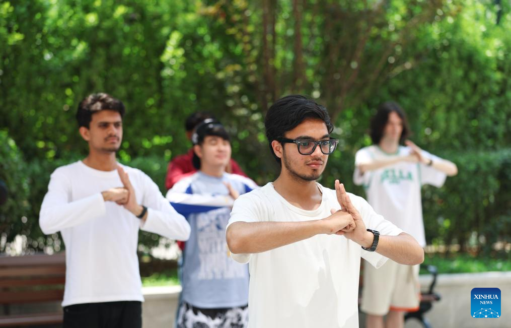 Muhammad Mohsin (front) practices Baduanjin, a traditional Chinese fitness routine, at Tianjin International Chinese College in north China's Tianjin, July 22, 2025. (Xinhua/Sun Fanyue)