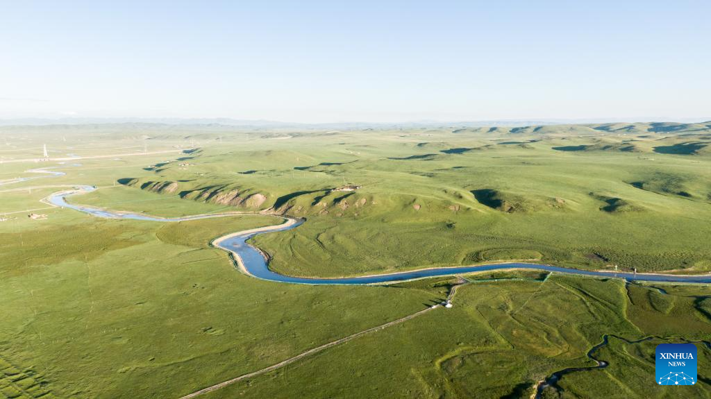 An aerial drone photo taken on July 30, 2025 shows the scenery on a grassland in Zeku County, Huangnan Tibetan Autonomous Prefecture, northwest China's Qinghai Province. (Xinhua/Wang Yan)
