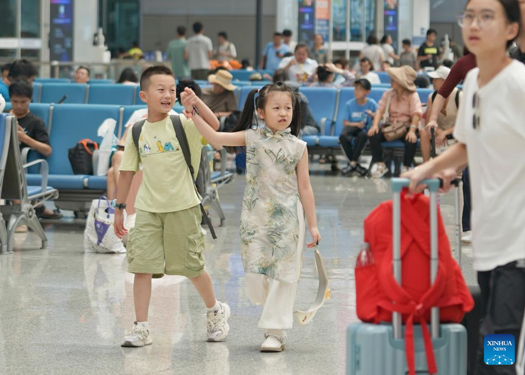 Two children are pictured at Guiyang North Railway Station in Guiyang, southwest China's Guizhou Province, Aug. 1, 2025. This year's summer travel rush will last for 62 days from July 1 to Aug. 31. From July 1 to 31, the country's railways had handled 441 million passenger trips with an increase of 4.3 percent year-on-year, and the daily average number of passenger trips was 14.213 million, according to China State Railway Group Co., Ltd.
