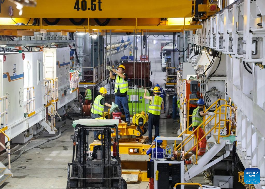 Technicians check a tunnel boring machine (TBM) at the construction site of a tunnel in Pingshan, Shenzhen City, south China's Guangdong Province, Aug. 1, 2025. A giant tunnel boring machine started operation on Friday to spearhead the excavation works for a tunnel along a railway linking Shenzhen and Shanwei special cooperation zone in Shenzhen.