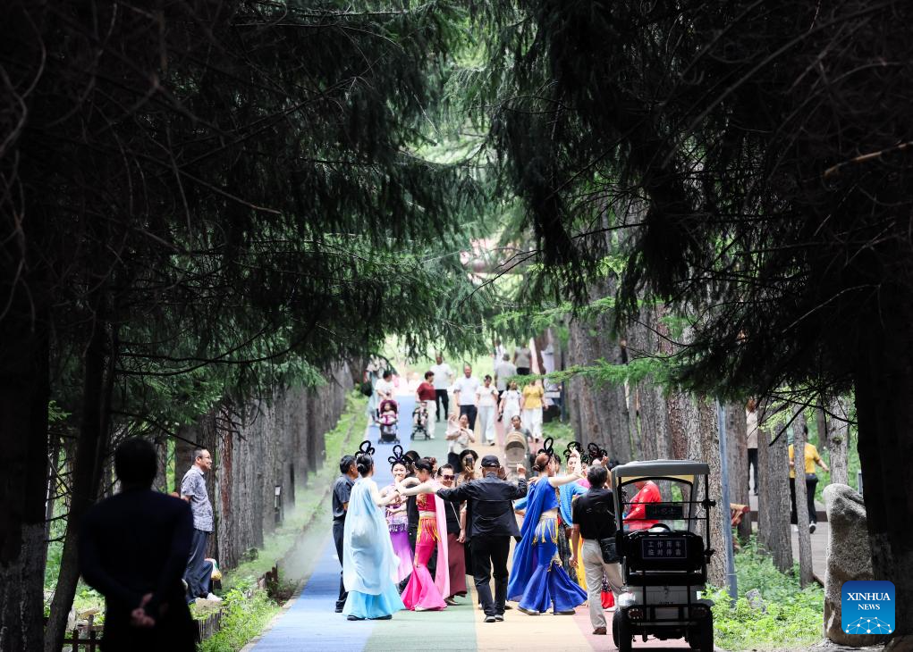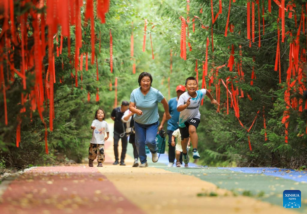 Tourists have fun at Foshan National Forest Park in Wusu City, northwest China's Xinjiang Uygur Autonomous Region, July 28, 2025. In recent days, multiple areas in Xinjiang have experienced sustained high temperatures, prompting residents and tourists to seek relief in cooler scenic spots.