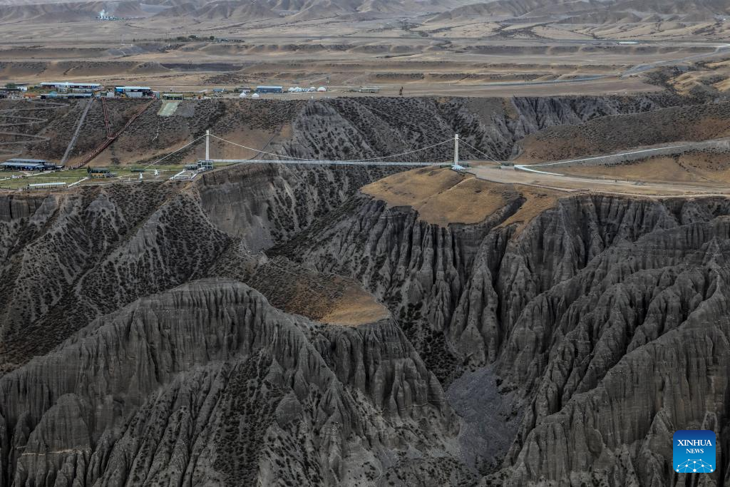 This photo shows a canyon in Wusu City, northwest China's Xinjiang Uygur Autonomous Region, July 28, 2025. In recent days, multiple areas in Xinjiang have experienced sustained high temperatures, prompting residents and tourists to seek relief in cooler scenic spots.
