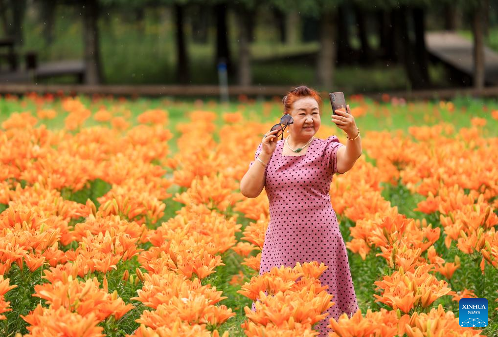 A tourist takes selfies at Foshan National Forest Park in Wusu City, northwest China's Xinjiang Uygur Autonomous Region, July 28, 2025. In recent days, multiple areas in Xinjiang have experienced sustained high temperatures, prompting residents and tourists to seek relief in cooler scenic spots.