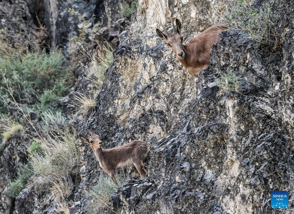 Antelopes are pictured at a scenic spot in Wusu City, northwest China's Xinjiang Uygur Autonomous Region, July 29, 2025. In recent days, multiple areas in Xinjiang have experienced sustained high temperatures, prompting residents and tourists to seek relief in cooler scenic spots.