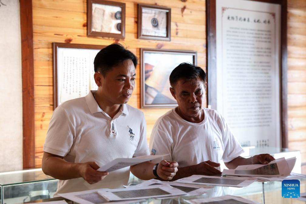 Wang Zhenzhong (L) and Wang Shubao arrange copies of Geng Lu Bu at a museum in Qionghai, south China's Hainan Province, July 22, 2025. (Xinhua/Cheng Tingting)