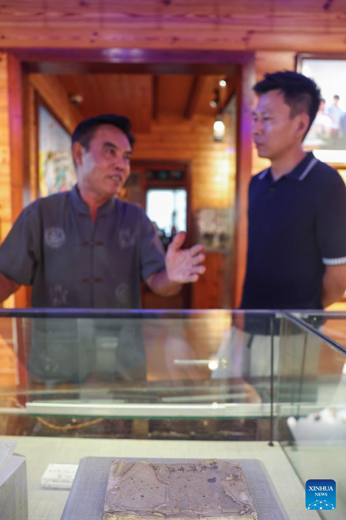 Wang Shubao arranges copies of Geng Lu Bu at a museum in Qionghai, south China's Hainan Province, July 22, 2025. (Xinhua/Cheng Tingting)