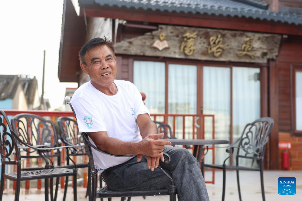 Wang Shubao sits in front of a museum in Qionghai, south China's Hainan Province, July 22, 2025. (Xinhua/Zhang Liyun)