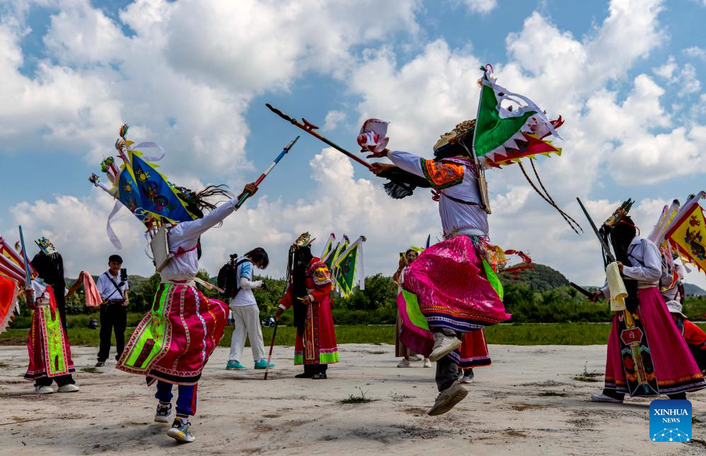 Actors take part in a Dixi opera parade at the Miaoling Tunpu scenic area in Xixiu District of Anshun City, southwest China's Guizhou Province, Aug. 2, 2025. Anshun Dixi Opera is an important part of Tunpu culture dating back to the Ming Dynasty (1368-1644). The opera has been listed as a national intangible cultural heritage item in 2006. (Photo by Chen Xi/Xinhua)