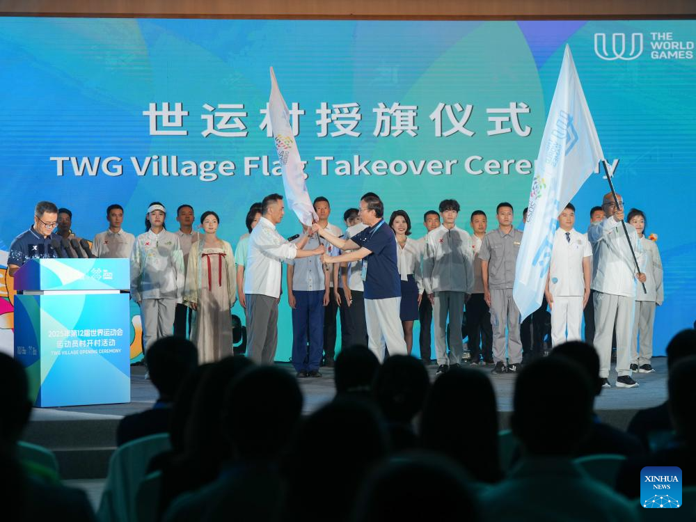 Photo taken on Aug. 3, 2025 shows the flag takeover ceremony of the TWG village for The World Games (TWG) 2025 Chengdu in Chengdu, southwest China's Sichuan Province. (Xinhua/Wang Xi)