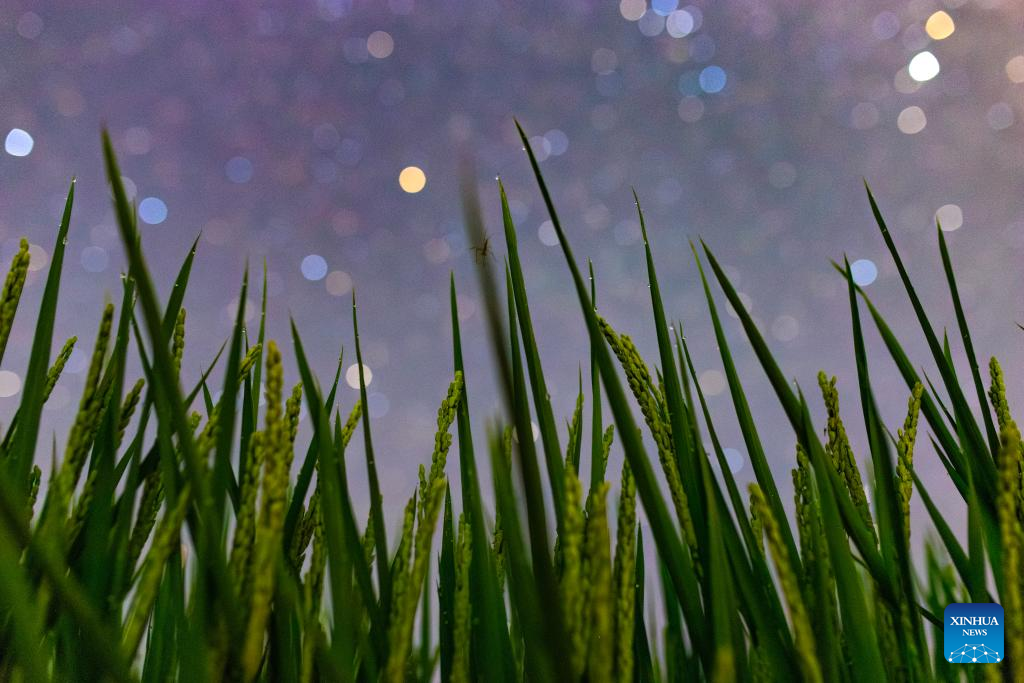 This photo taken on July 25, 2025 shows a paddy field under the starry sky in Yanshan Town of Fujin City, northeast China's Heilongjiang Province. Heilongjiang Province, a major agricultural producer dubbed "China's grain barn," have seen its crops enter the ripening stage recently. (Photo by Qu Yubao/Xinhua)