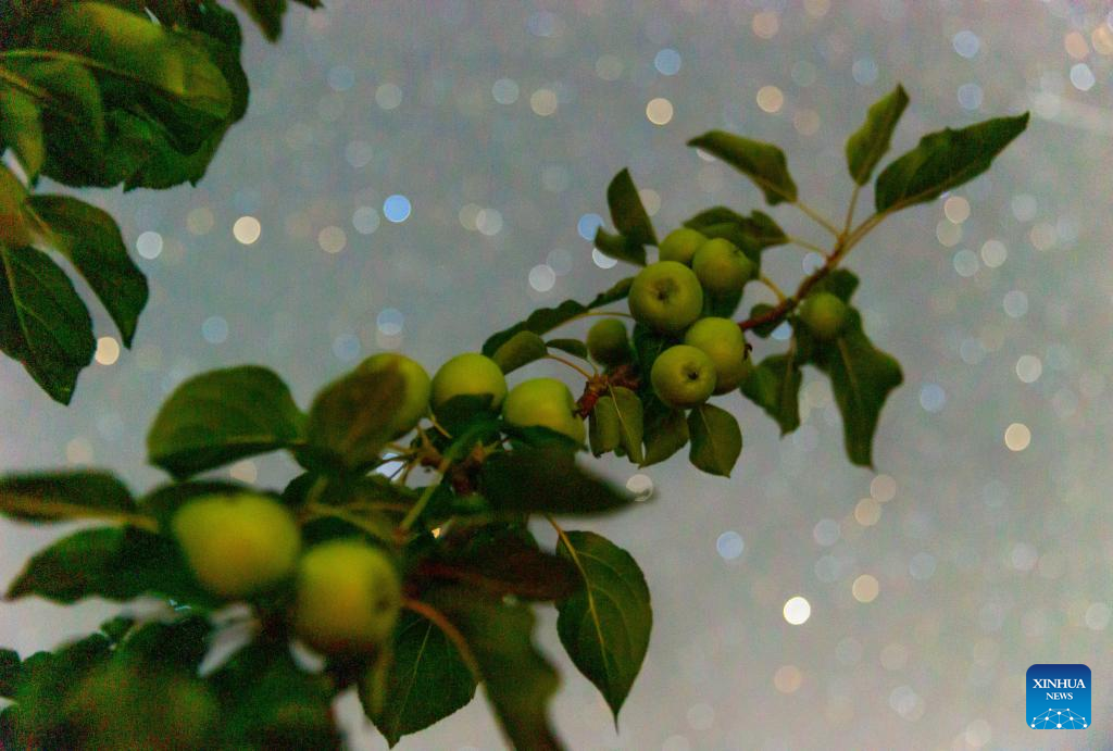 This photo taken on July 25, 2025 shows crabapples under the starry sky in Jixiang Town of Tangyuan County, Jiamusi City, northeast China's Heilongjiang Province. Heilongjiang Province, a major agricultural producer dubbed "China's grain barn," have seen its crops enter the ripening stage recently. (Photo by Zhu Zongqiang/Xinhua)