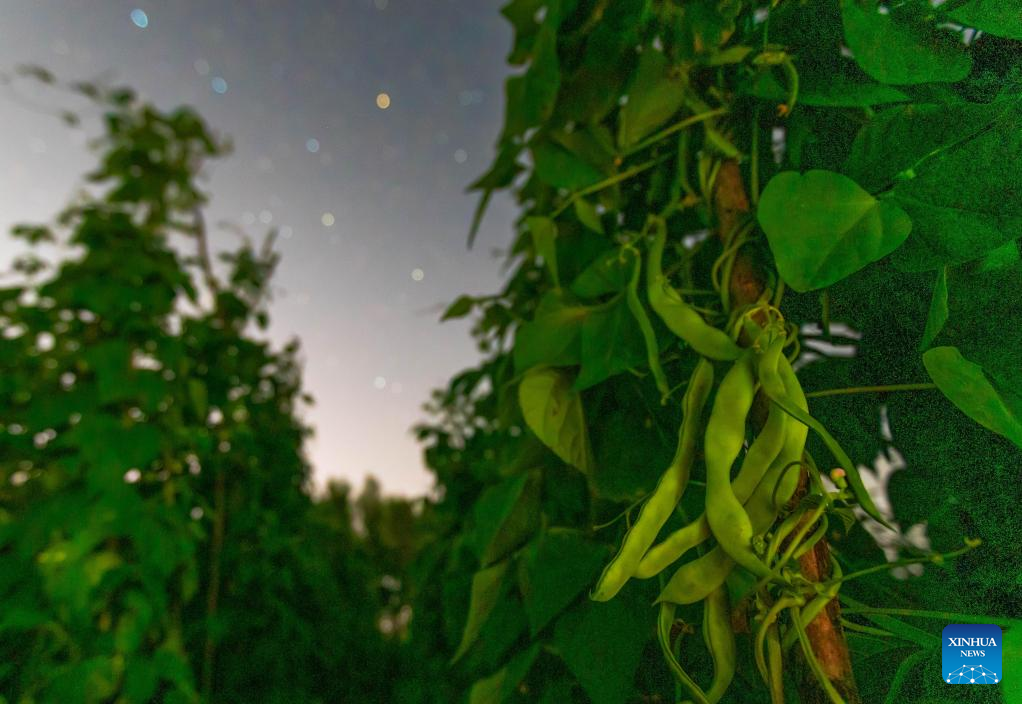 This photo taken on July 26, 2025 shows green beans in a field under the starry sky in Lianjiangkou Town of Jiamusi City, northeast China's Heilongjiang Province. Heilongjiang Province, a major agricultural producer dubbed "China's grain barn," have seen its crops enter the ripening stage recently. (Photo by Zhu Zongqiang/Xinhua)