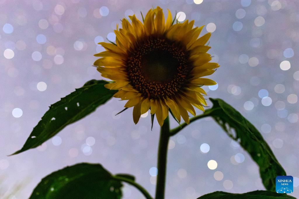 This photo taken on July 28, 2025 shows a sunflower under the starry sky in Dayushu Town of Fujin City, northeast China's Heilongjiang Province. Heilongjiang Province, a major agricultural producer dubbed "China's grain barn," have seen its crops enter the ripening stage recently. (Photo by Qu Yubao/Xinhua)