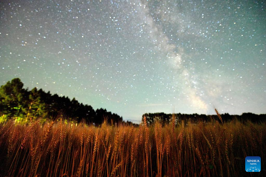 This photo taken on July 27, 2025 shows a wheat field under the starry sky in Heihe City, northeast China's Heilongjiang Province. Heilongjiang Province, a major agricultural producer dubbed "China's grain barn," have seen its crops enter the ripening stage recently. (Photo by Qian Boyu/Xinhua)