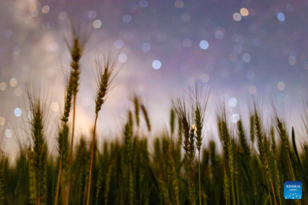 This photo taken on July 21, 2025 shows a wheat field under the starry sky in Chang'an Town of Fujin City, northeast China's Heilongjiang Province. Heilongjiang Province, a major agricultural producer dubbed "China's grain barn," have seen its crops enter the ripening stage recently. (Photo by Qu Yubao/Xinhua)