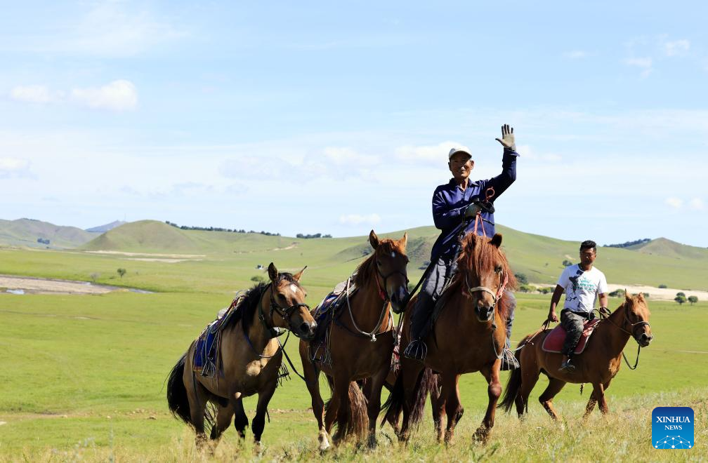 Herdsmen are pictured on the Ulan Butong grassland in Hexigten Banner of Chifeng, north China's Inner Mongolia Autonomous Region, Aug. 7, 2025. Rich in natural tourism resources, the Ulan Butong scenic area features lakes, grasslands, and forests, attracting numerous visitors. (Xinhua/Jia Lijun)