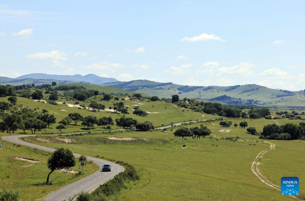 This photo taken on Aug. 7, 2025 shows a view of the Ulan Butong grassland in Hexigten Banner of Chifeng, north China's Inner Mongolia Autonomous Region. Rich in natural tourism resources, the Ulan Butong scenic area features lakes, grasslands, and forests, attracting numerous visitors. (Xinhua/Jia Lijun)