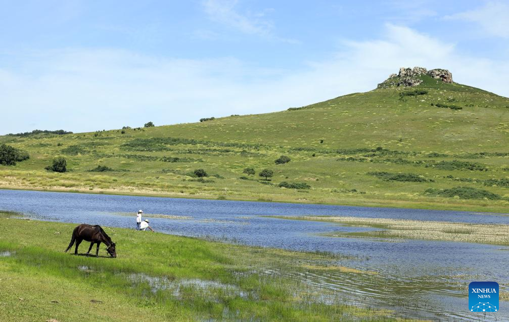 A horse grazes on the Ulan Butong grassland in Hexigten Banner of Chifeng, north China's Inner Mongolia Autonomous Region, Aug. 7, 2025. Rich in natural tourism resources, the Ulan Butong scenic area features lakes, grasslands, and forests, attracting numerous visitors. (Xinhua/Jia Lijun)