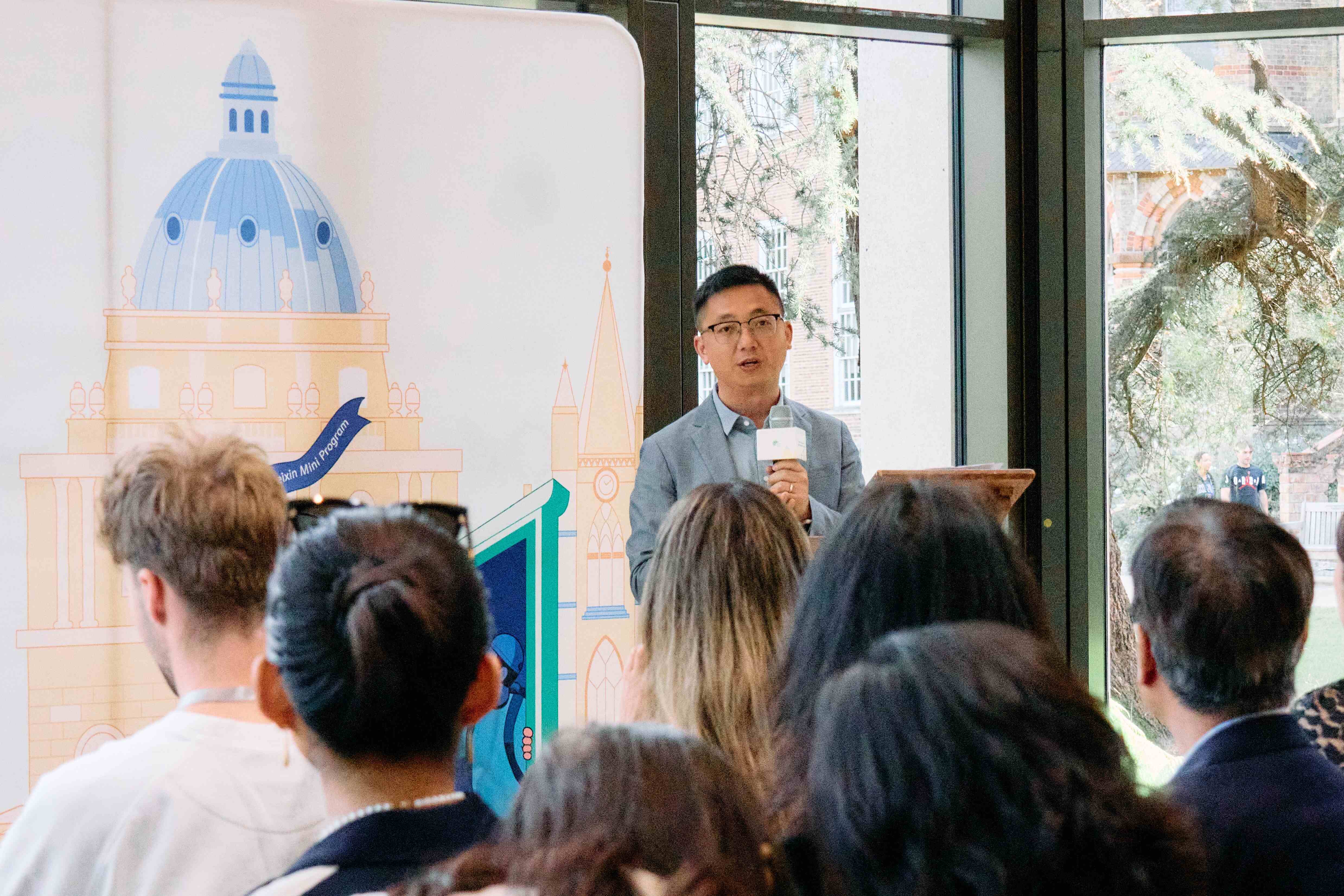 Pan Hang, assistant director of the China National Tourist Office in London, delivers a speech in Oxford, Britain, Aug. 5, 2025. (Photo/Zhao Wenkai)