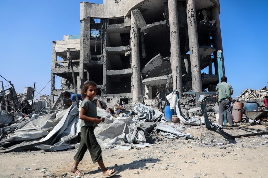Palestinians are seen among the rubble after an Israeli airstrike in the Sheikh Radwan area, northwest of Gaza City, on Aug. 6, 2025. (Photo by Rizek Abdeljawad/Xinhua)
