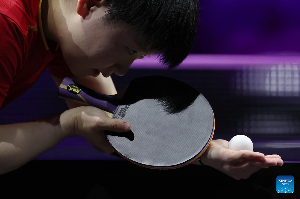 Sun Yingsha of China hits a return during the women's singles semifinal match between Sun Yingsha of China and Shi Xunyao of China at the WTT Champions Yokohama 2025 in Yokohama, Japan, Aug. 11, 2025. (Xinhua/Jia Haocheng)