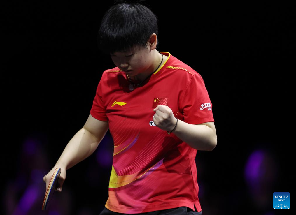 Shi Xunyao of China reacts during the women's singles semifinal match between Sun Yingsha of China and Shi Xunyao of China at the WTT Champions Yokohama 2025 in Yokohama, Japan, Aug. 11, 2025. (Xinhua/Jia Haocheng)