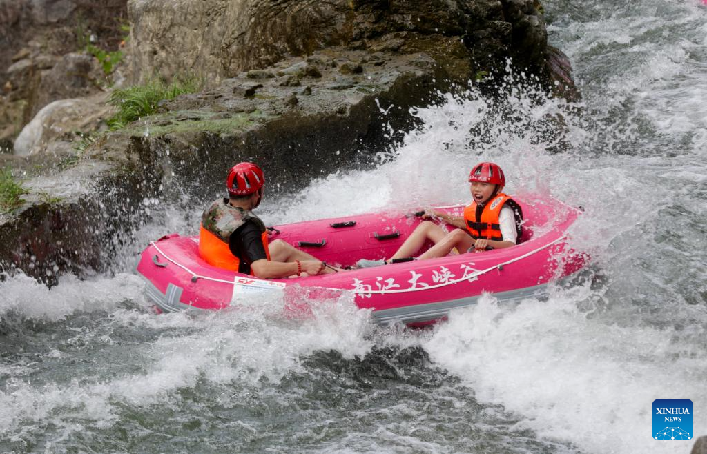 Tourists enjoy canyon rafting at a scenic spot in Kaiyang County, southwest China's Guizhou Province, on Aug. 10, 2025. Scenic areas across China have entered peak season for tourism during summer vacation. (Photo by Yuan Hongfu/Xinhua)