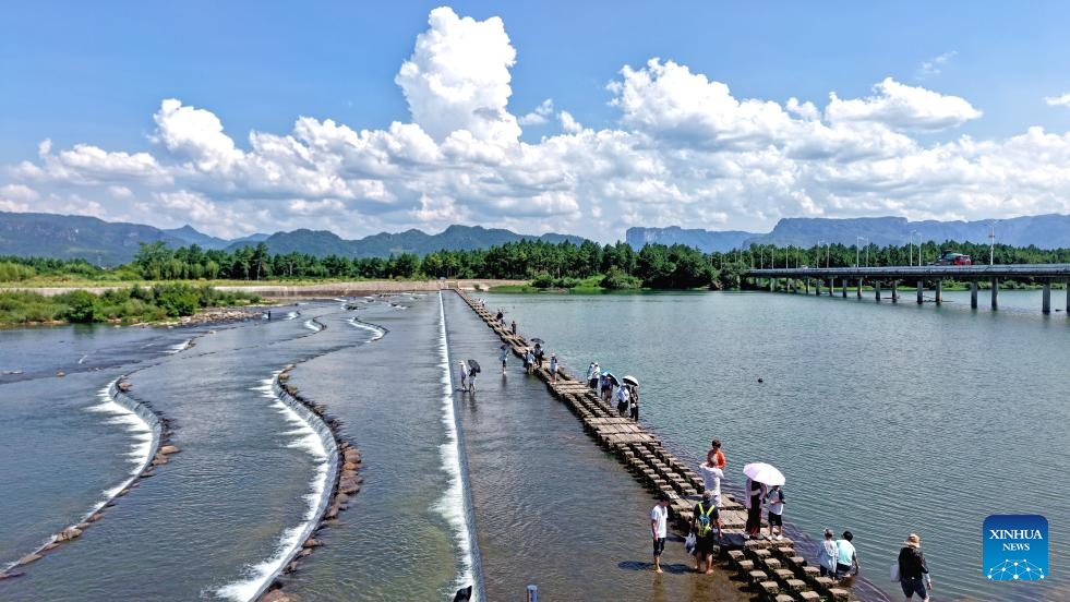 A drone photo taken on Aug. 11, 2025 shows tourists having fun along a river in Xianju County of Taizhou, east China's Zhejiang Province. Scenic areas across China have entered peak season for tourism during summer vacation. (Photo by Wang Huabin/Xinhua)