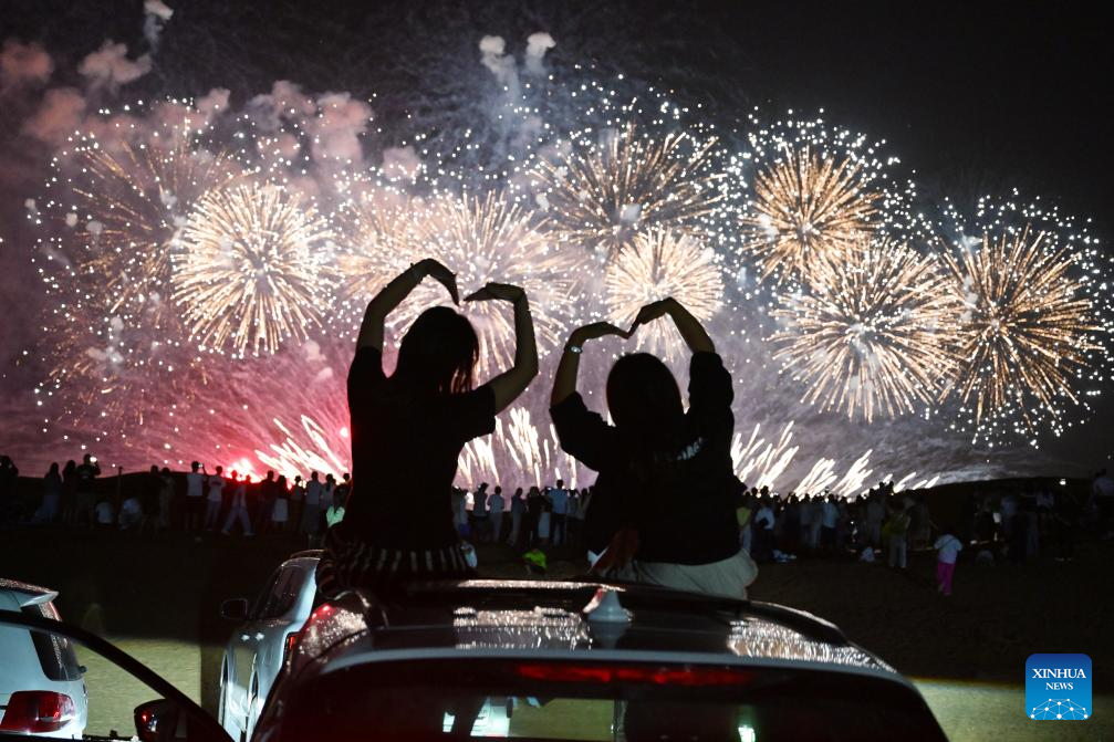 Tourists watch a firework show in Shapotou District of Zhongwei, northwest China's Ningxia Hui Autonomous Region, on Aug. 10, 2025. Scenic areas across China have entered peak season for tourism during summer vacation. (Photo by Yuan Hongyan/Xinhua)
