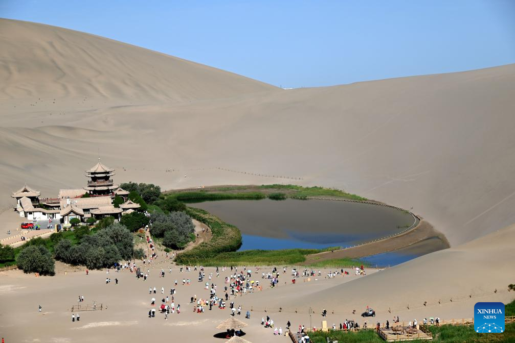 Tourists visit the Mingsha Mountain and Crescent Spring scenic spot in Dunhuang City, northwest China's Gansu Province, on Aug. 9, 2025. Scenic areas across China have entered peak season for tourism during summer vacation. (Photo by Zhang Xiaoliang/Xinhua)