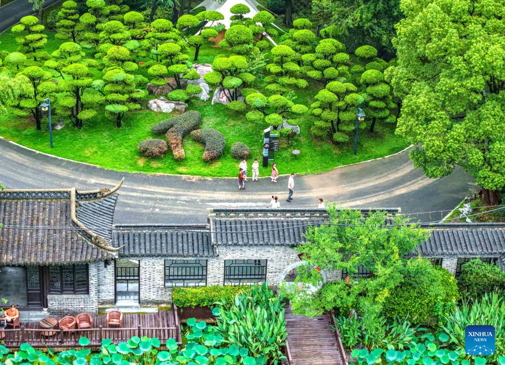 An aerial drone photo taken on Aug. 10, 2025 shows tourists having fun at a garden in Yangzhou, east China's Jiangsu Province. Scenic areas across China have entered peak season for tourism during summer vacation. (Photo by Ren Fei/Xinhua)