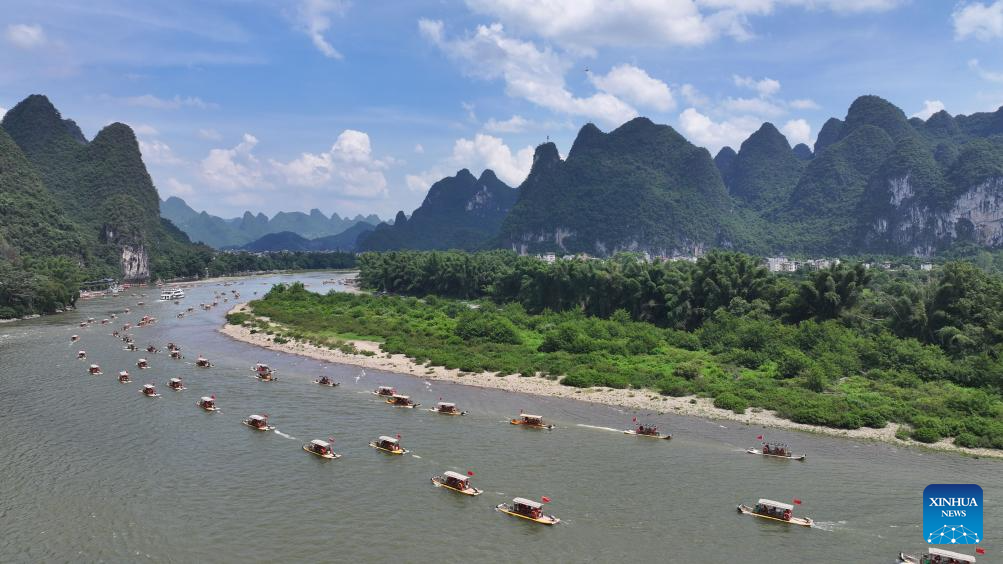 An aerial drone photo taken on Aug. 10, 2025 shows tourists enjoying the scenery on bamboo rafts along the Lijiang river in Yangshuo County, south China's Guangxi Zhuang Autonomous Region. Scenic areas across China have entered peak season for tourism during summer vacation. (Photo by He Hongfu/Xinhua)
