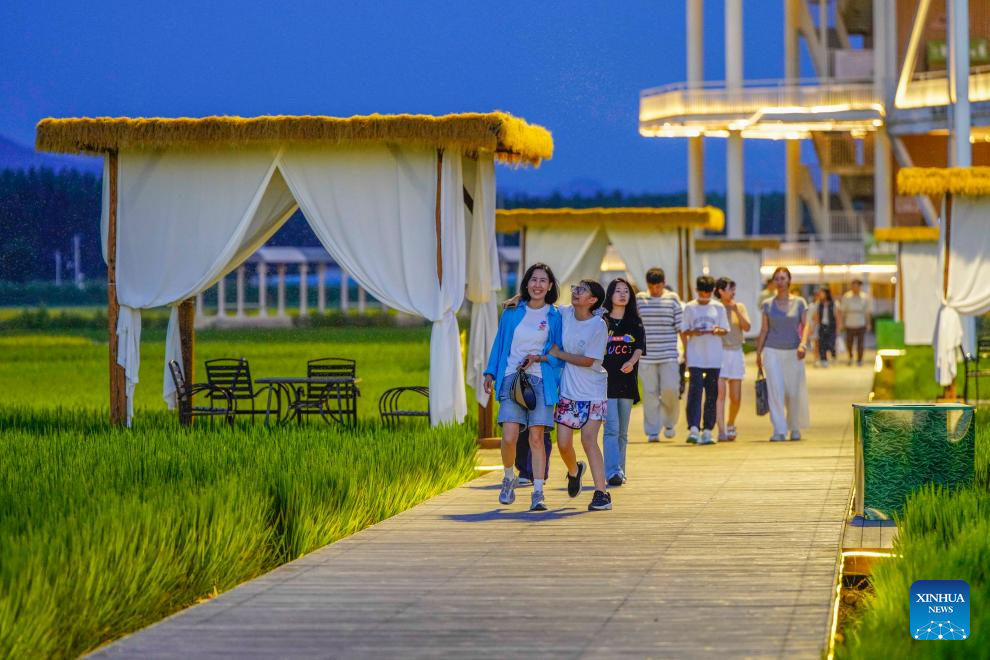 A drone photo taken on Aug. 9, 2025 shows tourists visiting a scenic spot at night in Leling City, east China's Shandong Province. Scenic areas across China have entered peak season for tourism during summer vacation. (Photo by Jia Peng/Xinhua)