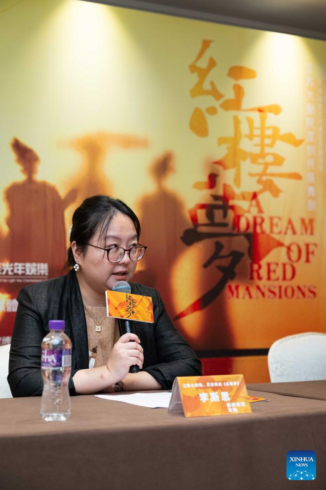 Li Sisi, deputy general manager of Jiangsu Center for the Performing Arts and producer of the original folk dance drama "Dream of the Red Mansions", speaks at a press conference held in Macao, south China, on Aug. 11, 2025. The drama, produced by Jiangsu Center for the Performing Arts, will be staged at the Macao Cultural Centre in Macao from Aug. 15 to 17.
