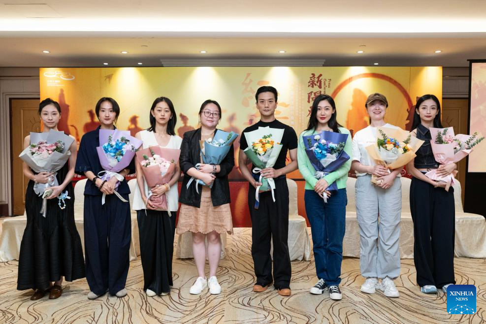 This photo taken on Aug. 11, 2025 shows a scene of a press conference for the original folk dance drama "Dream of the Red Mansions" held in Macao, south China. The drama, produced by Jiangsu Center for the Performing Arts, will be staged at the Macao Cultural Centre in Macao from Aug. 15 to 17.