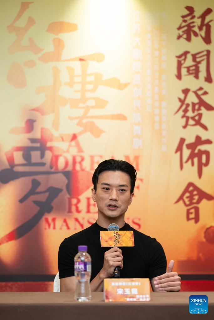 Actor Song Yulong speaks at a press conference for the original folk dance drama "Dream of the Red Mansions" in Macao, south China, on Aug. 11, 2025. The drama, produced by Jiangsu Center for the Performing Arts, will be staged at the Macao Cultural Centre in Macao from Aug. 15 to 17.