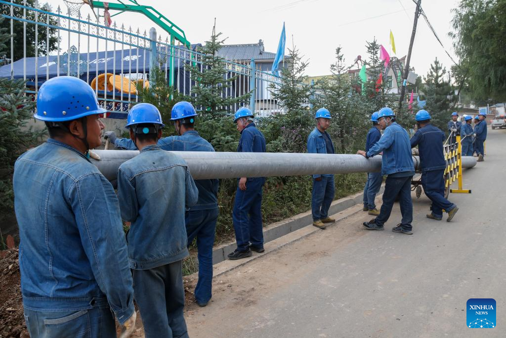 Workers erect a utility pole in Shangzhuang Village, Yuzhong County of northwest China's Gansu Province, Aug. 11, 2025. Roads damaged by mountain torrents in Yuzhong County reopened on Sunday and power supply has been restored following the disaster that left 13 dead and 30 missing. (Xinhua/Lang Bingbing)