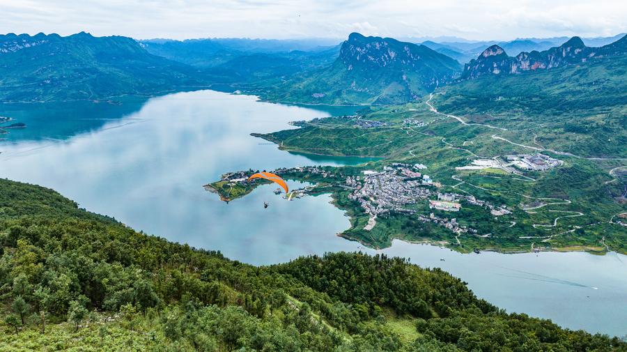 GUIYANG, Aug. 12 (Xinhua) -- Amid the scorching summer, the karst landscape in southwest China's Guizhou Province comes alive as a refreshing escape, with paragliders drifting across the azure sky, and deep below, headlamps flickering in the stillness of ancient caves.