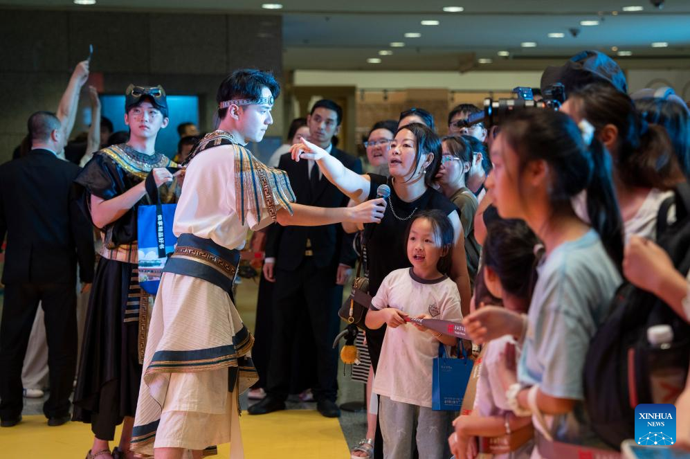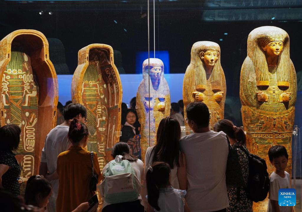 People visit the exhibition "On Top of the Pyramid: The Civilization of Ancient Egypt" at the Shanghai Museum at night in Shanghai, east China, Aug. 11, 2025. The exhibition, titled "On Top of the Pyramid: The Civilization of Ancient Egypt," opens 24 hours a day from Aug. 11 to 17 at the Shanghai Museum. During the 168-hour carnival, there will also be new books releases, Egyptian dancing performances, interactive games and cultural and creative production promotions here. (Photo by Zhang Yue/Xinhua)