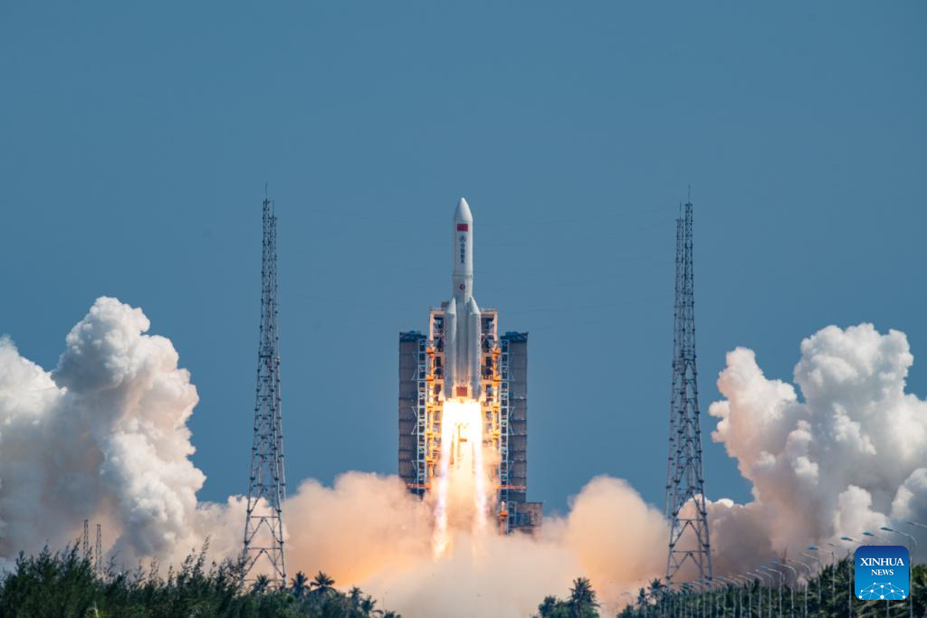 A Long March-5B carrier rocket carrying a group of low Earth orbit satellites blasts off from the Wenchang Space Launch Site in south China's Hainan Province, Aug. 13, 2025. This satellite group, the eighth of its kind that will constitute an internet constellation, was launched at 2:43 p.m. (Beijing Time) aboard a Long March-5B carrier rocket, featuring a Yuanzheng-2 (Expedition-2) upper stage at the top of the rocket. (Xinhua/Guo Cheng)