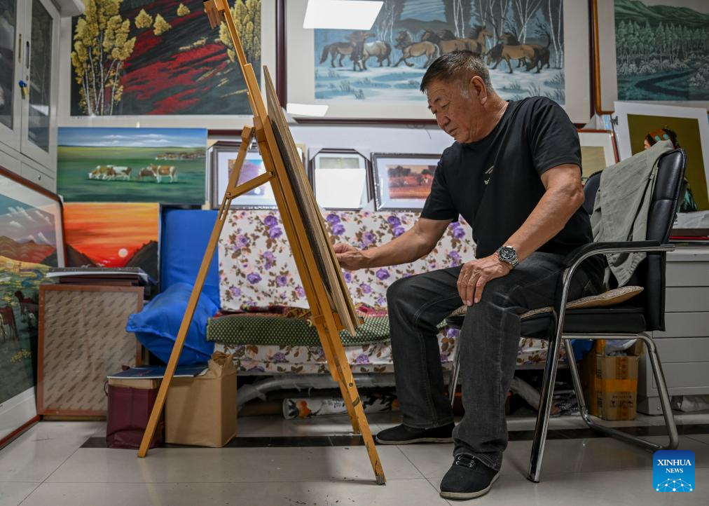 Painter Qi Tongyue introduces his artworks at a woodblock painting institute in Jarud Banner, north China's Inner Mongolia Autonomous Region, Aug. 10, 2025. (Xinhua/Liu Wenhui)