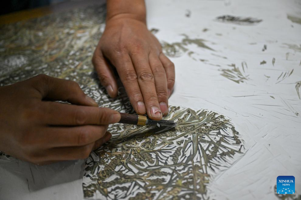 Painter Shi Fangyu creates a Jarud woodblock painting at a woodblock painting institute in Jarud Banner, north China's Inner Mongolia Autonomous Region, Aug. 10, 2025. (Xinhua/Lian Zhen)
