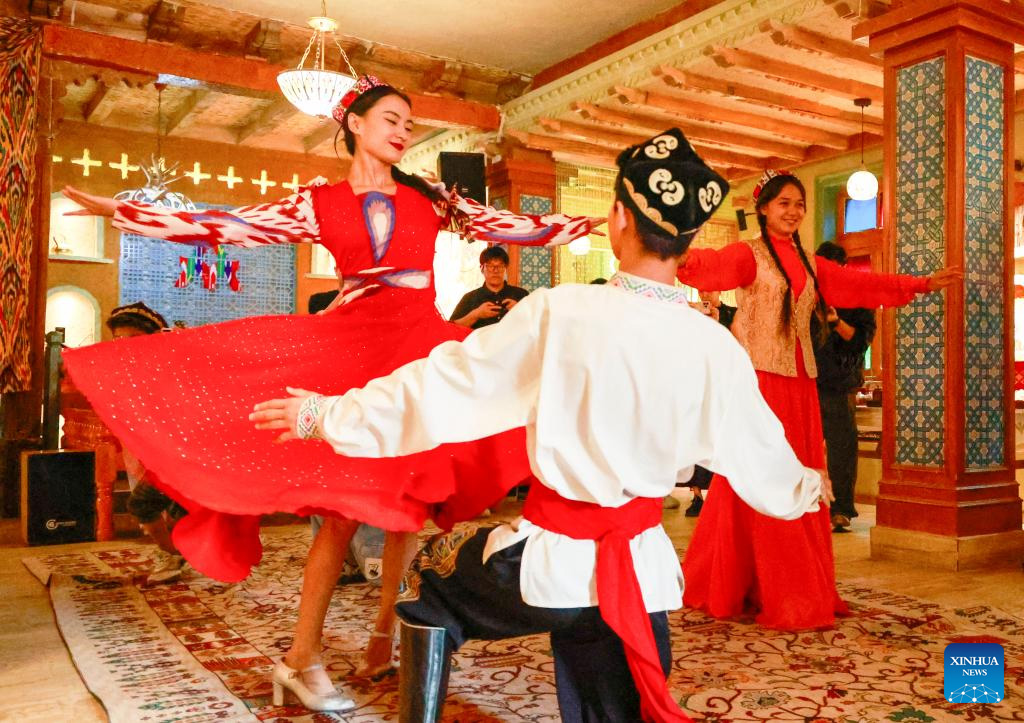 Dancers perform at a specialty store in Tuancheng of Hotan City, northwest China's Xinjiang Uygur Autonomous Region, Aug. 14, 2025. Tuancheng, which means the town of unity, is a typical traditional neighborhood in south Xinjiang.